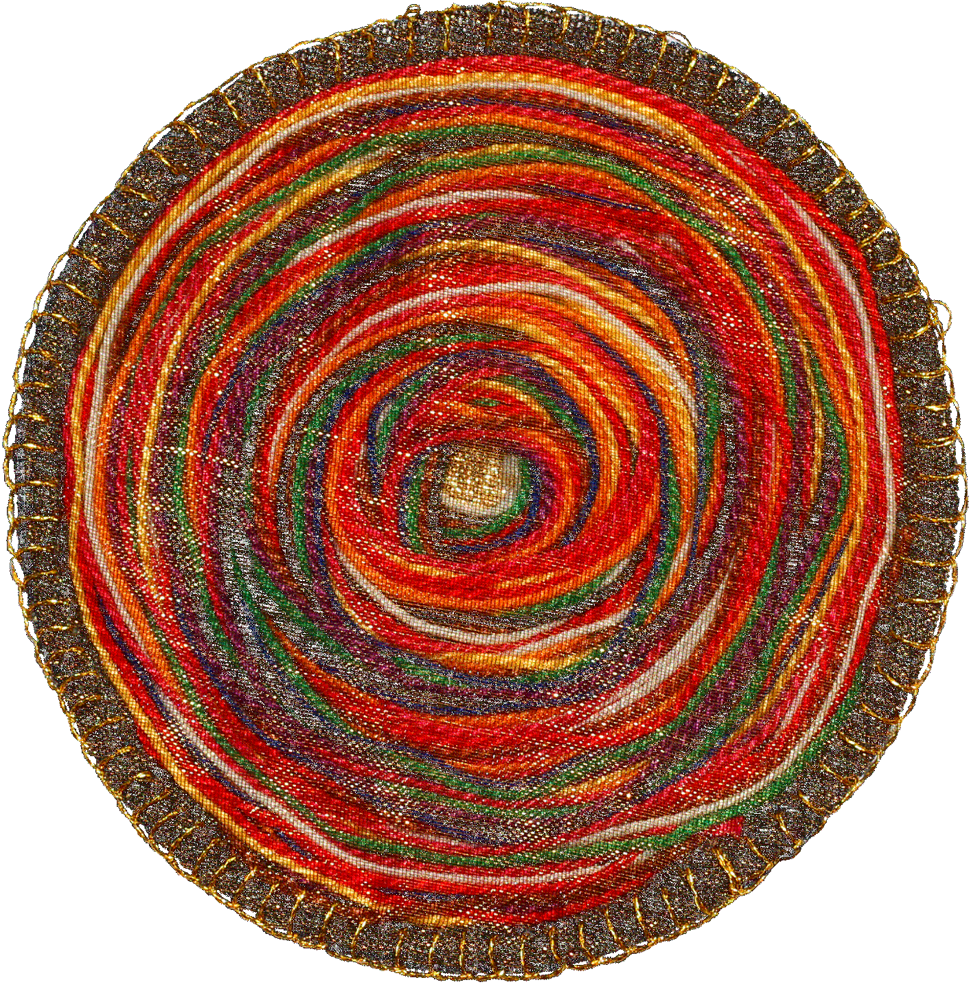 - um círculo de tecido preto representando o aparente vazio pré-existencial, pleno de potencial, do centro do qual surge um Ponto de Luz dourado, o início da Criação, que, uma vez corporificada num Ser, este parte num movimento espiralado pela diversidade periférica, em fios coloridos numa composição cromática pessoal abrangendo todo o círculo, no limiar do qual encontra a aura de fio dourado luminoso, invocadora da sua Luz Central, que o faz iniciar o Caminho de Retorno à Essência, numa síntese pessoal-transpessoal aqui representada por um tecido dourado transparente e luminoso que cobre toda a mandala expandindo a aura dourada luminescente do Ser Total.